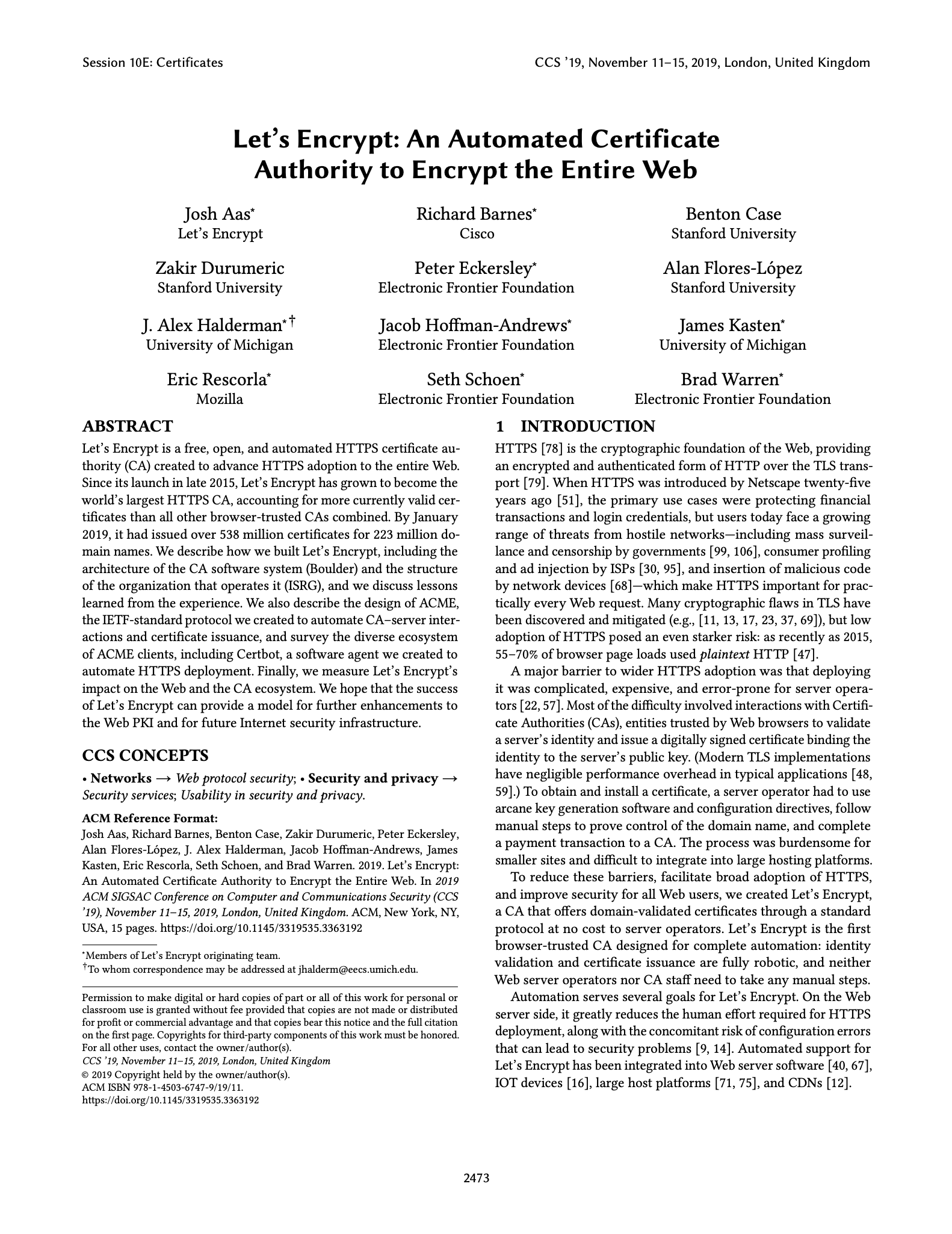 Josh Aas, Richard Barnes, Benton Case, Zakir Durumeric, Peter Eckersley, Alan Flores-Lรณpez, J. Alex Halderman, Jacob Hoffman-Andrews, James Kasten, Eric Rescorla, Seth Schoen, and Brad Warren. 2019. Let's Encrypt: An Automated Certificate Authority to Encrypt the Entire Web. In Proceedings of the 2019 ACM SIGSAC Conference on Computer and Communications Security (CCS '19). Association for Computing Machinery, New York, NY, USA, 2473โ€“2487. https://doi.org/10.1145/3319535.3363192