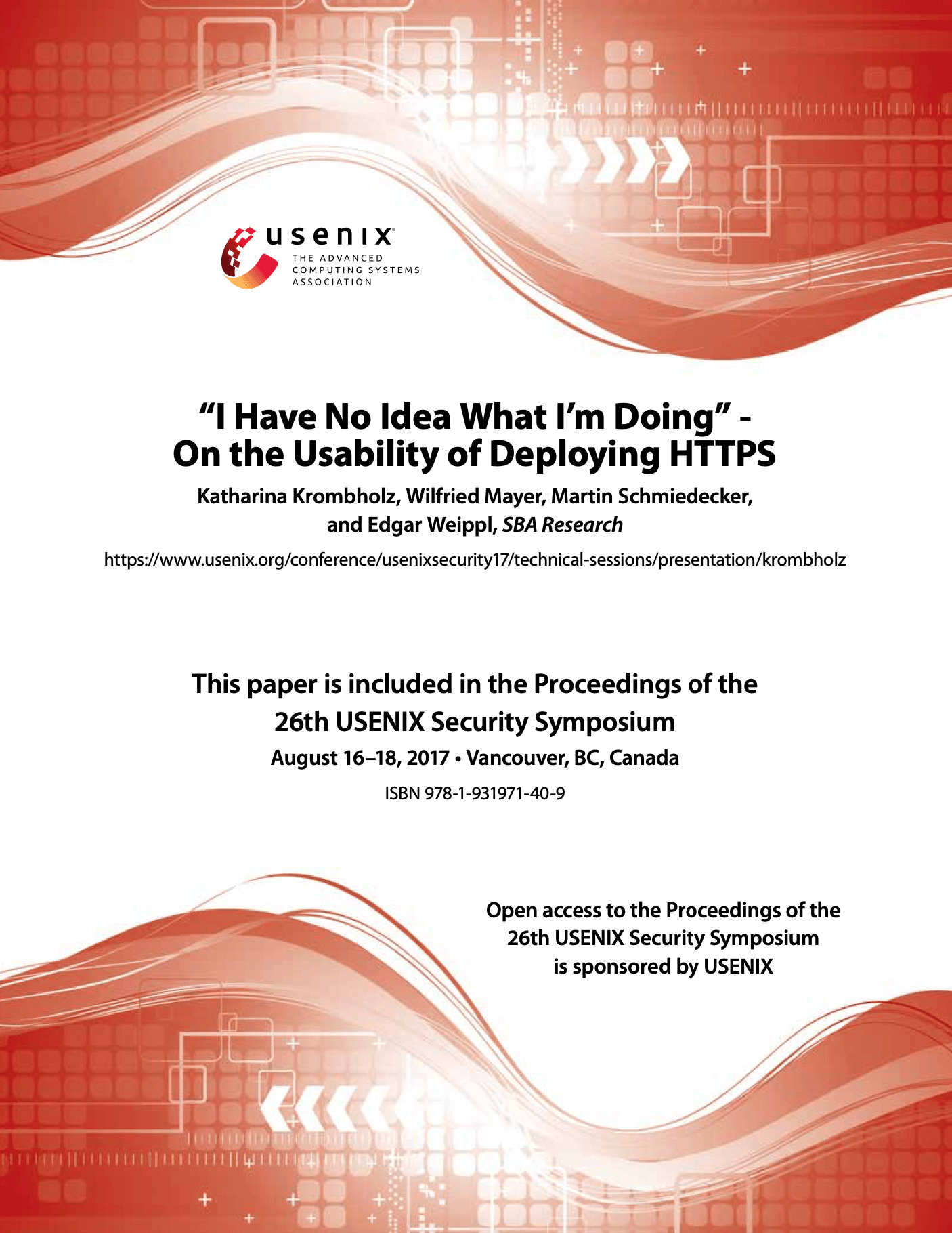 Katharina Krombholz, Wilfried Mayer, Martin Schmiedecker, and Edgar Weippl. 2017. "I Have No Idea What I'm Doing" - On the Usability of Deploying HTTPS. In 26th USENIX Security Symposium (USENIX Security 17), USENIX Association, Vancouver, BC, 1339-1356. Retrieved from https://www.usenix.org/conference/usenixsecurity17/technical-sessions/presentation/krombholz